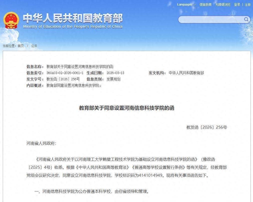 近日,教育部发布关于同意设置河南信息科技学院的函,同意以河南理工大学鹤壁工程技术学院为基础,设立河南信息科技学院。